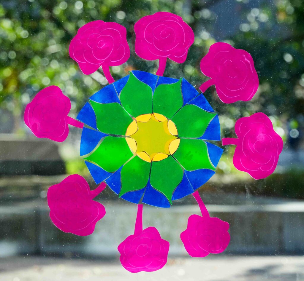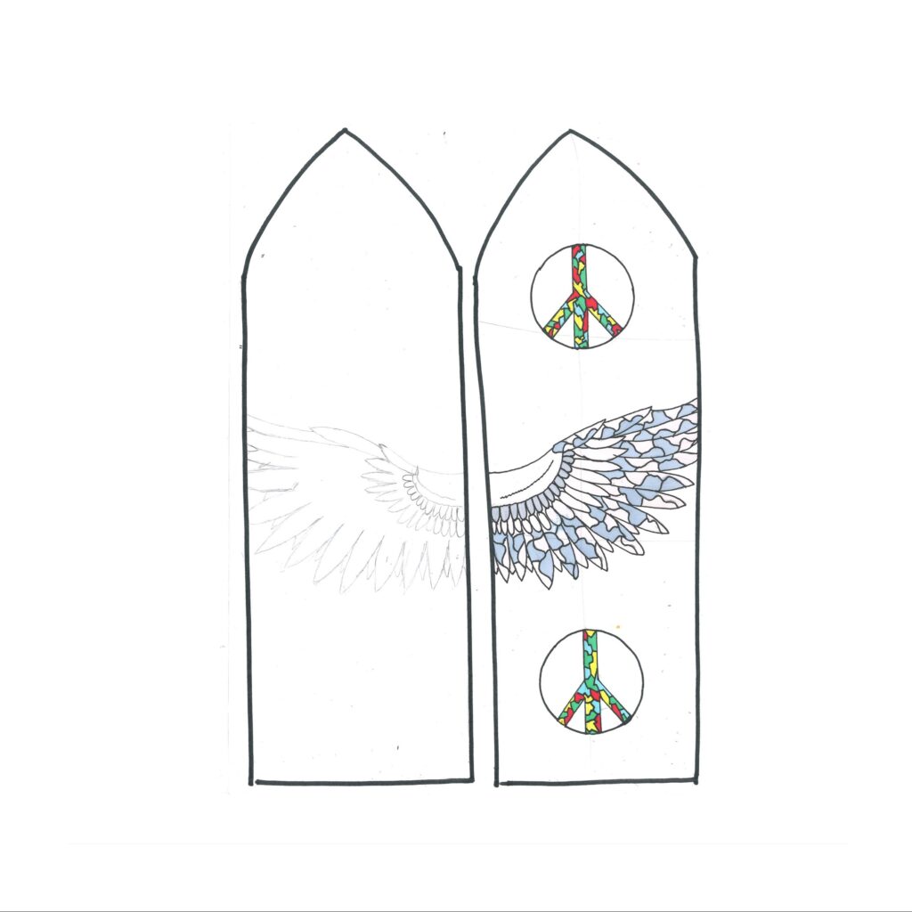 Onder begeleiding van Miranda van Bragt hebben leerlingen vanhet Frencken college een groot aantal kathedraal ramen gemaakt. In onderstaande blokken zie je de schets , de tekst en het resultaat. (indien je meer informatie hebt over je raam stuur dan een mail aan secretaris@vredesweekoosterhout.nl . dan wordt deze aangepast.