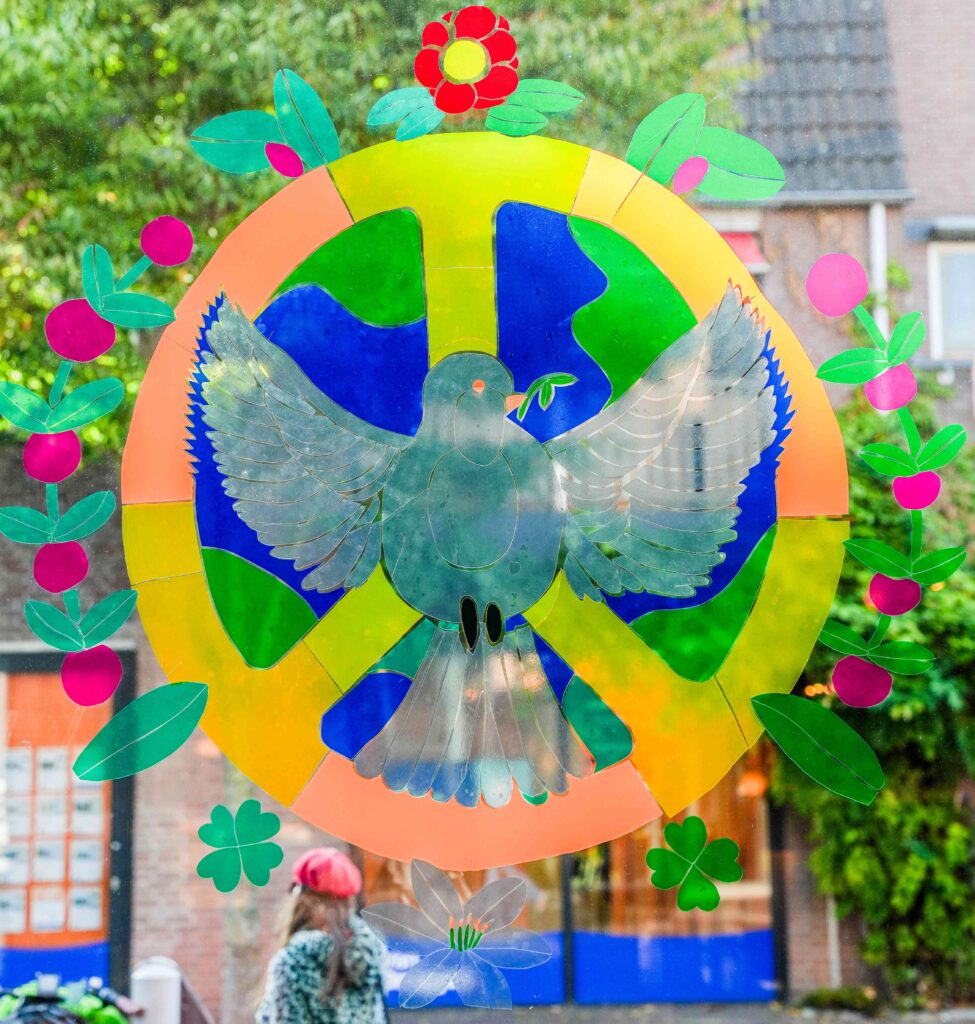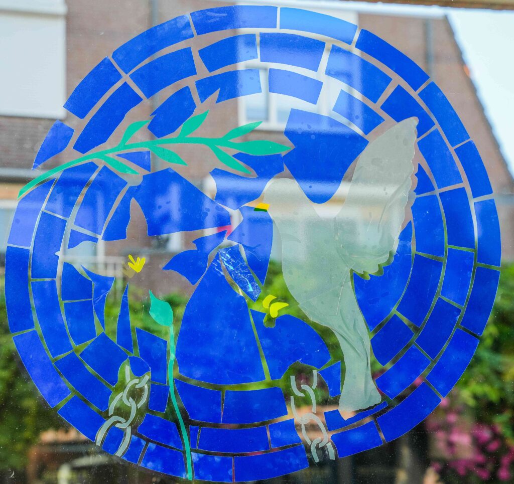 In dit roosvenster wordt vrede verbeeld in een spel van licht en kleur. In het hart straalt een witte lelie, symbool van zuiverheid, hoop en een nieuw begin. Daarboven zweeft een duif, kleiner en bescheiden, maar onmiskenbaar drager van vrede en verzoening. Een olijftak slingert zich sierlijk door het raam en verbindt de elementen met elkaar, terwijl onderaan een gebroken ketting getuigt van bevrijding en het doorbreken van geweld. De witte en blauwe kleuren die het geheel omhullen, laten het raam stralen van rust en harmonie, als een stille belofte van vrede die ieder raakt die ernaar kijkt.